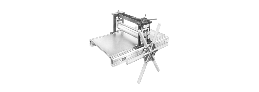 Development of the DPK-type copper printing press: The increase in roller presser is achieved not only through hardness and weight, but also by expanding their diameter. Copperplates, linocuts, woodcuts, and lithographs are pressed on the DPK.